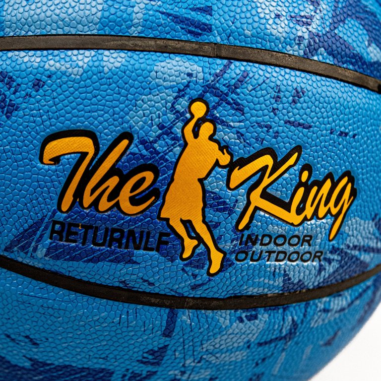 Výrazný Design "The King": Míč se pyšní dynamickým modrým grafickým potiskem, který zahrnuje abstraktní vzory a dominantní nápis "The King" se siluetou hráče. Tento design dodává míči agresivní a vítězný vzhled.