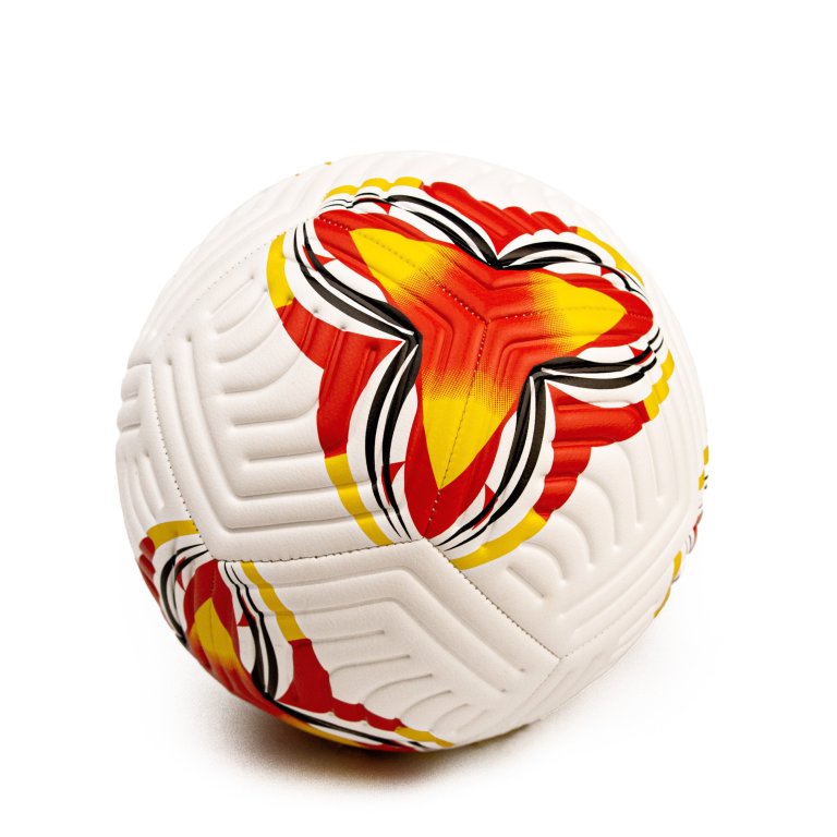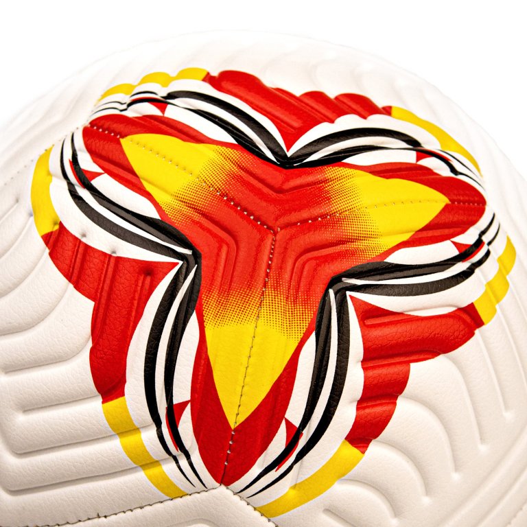 Dynamický Design: Míč se vyznačuje atraktivním bílým základem s výraznými grafickými prvky v kombinaci červené a žluté barvy. Tento moderní design zaručuje, že míč bude na hřišti dobře viditelný.