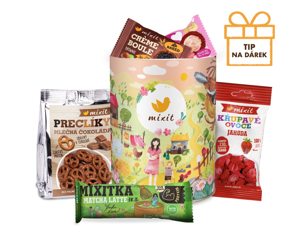 Poděkujte mamince za její lásku a starostlivost tubusem plným dobrot. Uvnitř najdete 5 svačinek bez palmového oleje a umělých látek, které jsou vhodné na cesty, do kanceláře a hravě se vejdou do kabelky nebo baťůžku. Do tubusu jsme ukryli preclíky v mléčné čokoládě, Matcha latte Mixitku a dvě Crème boule, Brownie a Love Berry. Nezapomněli jsme ani na přísun vitamínů, a tak maminku potěší i Křupavá jahoda.