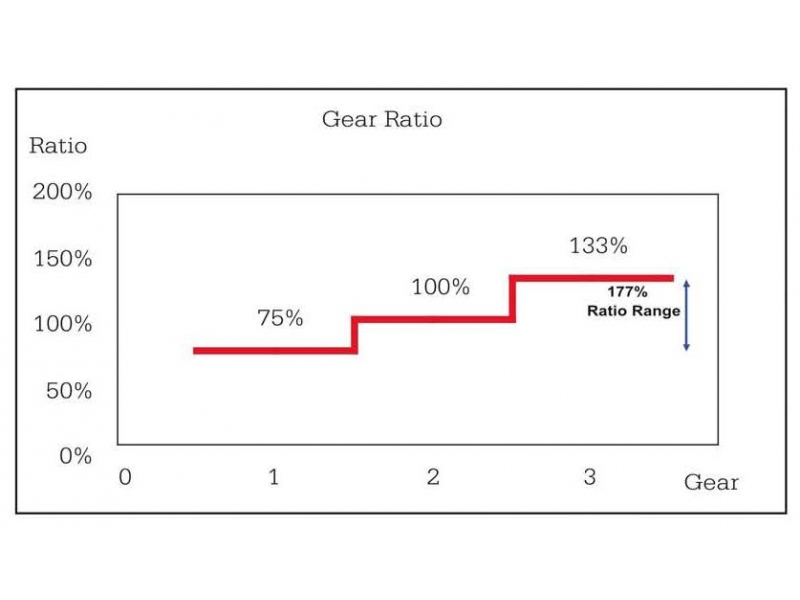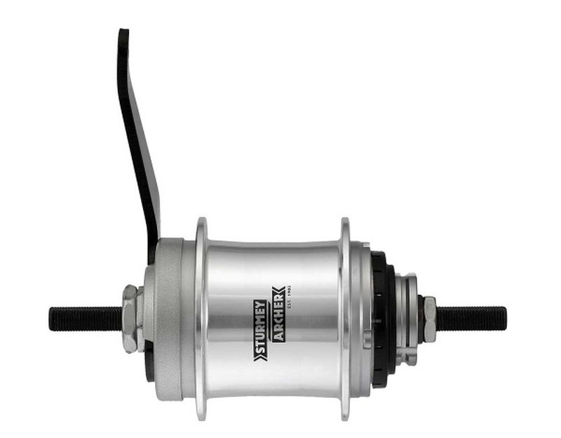 3-rychlostní náboj Sturmey-Archer S-RC3 s rozsahem 177% a protišlapnou brzdou.
