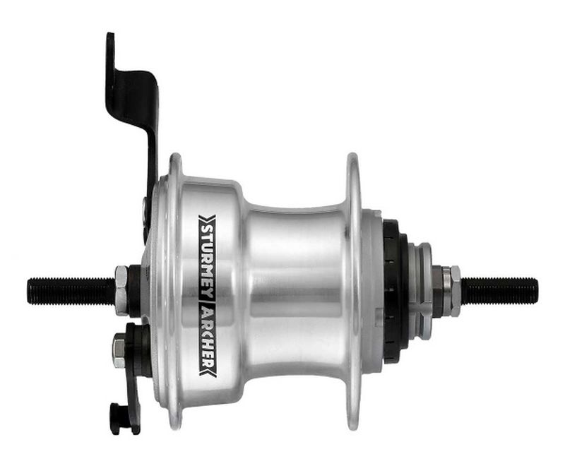 3-rychlostní náboj Sturmey-Archer RX-RD3 s rozsahem 177% a bubnovou brzdou 70 mm.