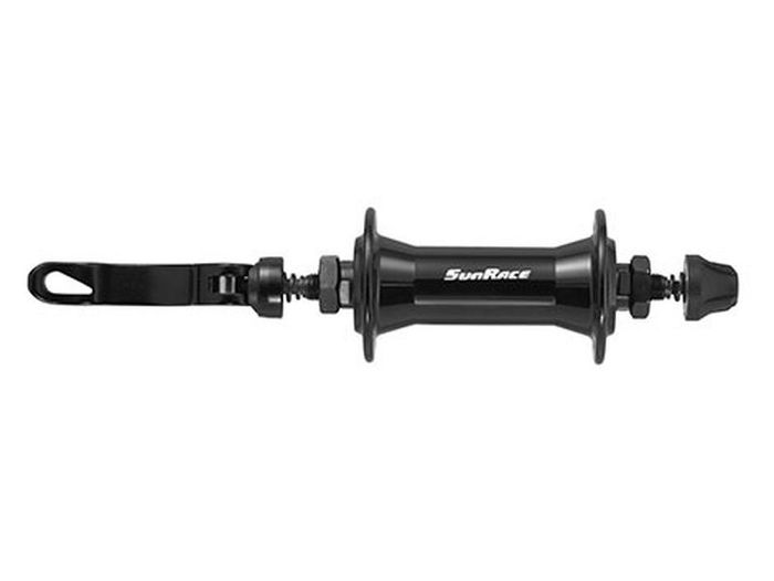 Přední náboj SunRace HBM45 s rychloupínáním Počet děr: 36 Šíře náboje: 100 mm Průměr osy: 9 mm Ložiska: volné kuličky Hmotnost: 208 g (vč. rychloupínáku) Materiál: Al Barva: černá