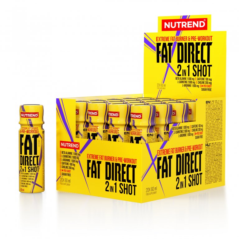 FAT DIRECT SHOT je zcela nový spalovač a nakopávač 2 v 1. Představuje unikátní spojení účinných látek pro podporu hubnutí a fyzického výkonu. Tento pomocník pro období dietního režimu i tvrdého tréninku zajistí stimulaci organismu, oddálí únavu a současně podpoří efektivitu metabolismu tuků. FAT DIRECT SHOT je bez cukru.