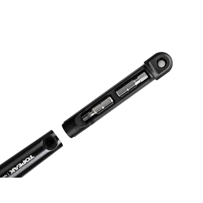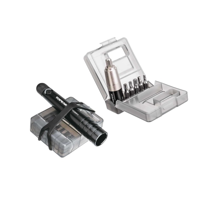 Miniaturní momentový momentový klíč s 2-6Nm nástavcem a sadou základních bitů zamezující poškození, vzniklému přetažením, například drahých karbonových částí. Dva bity mohou být umístěny přímo v těle klíče.