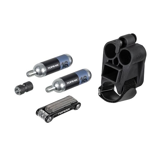 Kompaktní sada pro opravu pneumatik obsahuje hustilku CO2 Nano AirBooster, dvě 16g kartuše CO2 a skládací nářadí Mini 9 Pro pro silniční kola. Přiložený montážní modul s úchytným popruhem umožňuje snadné upevnění zařízení NanoMaster RXT na sedlovku nebo sedlovou trubku.