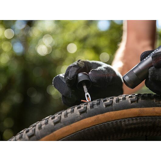 Kompletní sada pro opravu bezdušových pneumatik s CO2 hustilkou pro horská kola. Nástroje pro bezdušové opravy jsou integrovány do koncovek kapsle, které mají vroubkovaný povrch zajišťující lepší přilnavost při opravách pneumatik. Součástí balení jsou tři knoty, nůž s držákem a Nano AirBooster s 25g kartuší CO2. Vše upevněno na montážním modulu, který lze připevnit na rámovou trubku nebo sedlovku.