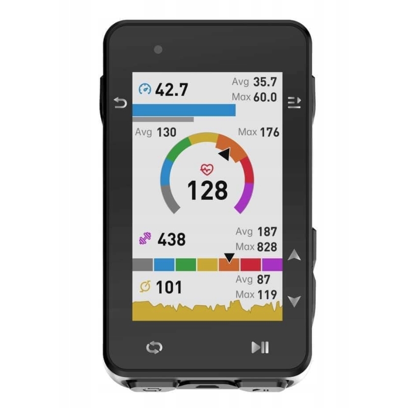 nabízí více než 150 cyklistických dat (rychlost, tepová frekvence, kadence, výkon, čas jízdy, aktuální čas, vzdálenost, nadm. výška, sklon, kalorie, okruhy)
