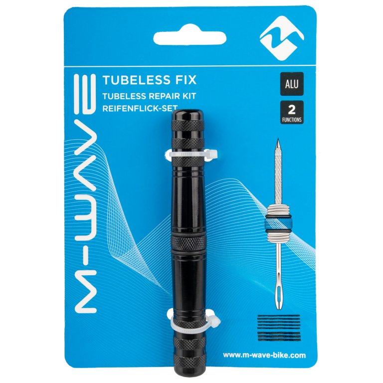 Opravná sada na pláště balení včetně knotů: 5x1,5mm, 3x3,5mm 2 funkce pouzdro použitelné jako páka velmi kvalitní hliníkové pouzdro barva: černá originální balení na kartě M-Wave