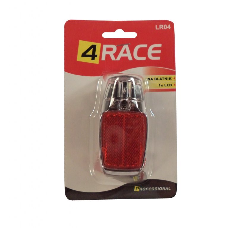 Osvětlení zadní na blatník transparentní s červeným reflektorem Dioda: 1x jasná červená LED dioda 0,5 W Funkce: rozsvíceno - vypnuto Balení obsahuje baterie: ano - 2xAAA Barva: černá Hmotnost: 35 g Balení: karta 4-RACE