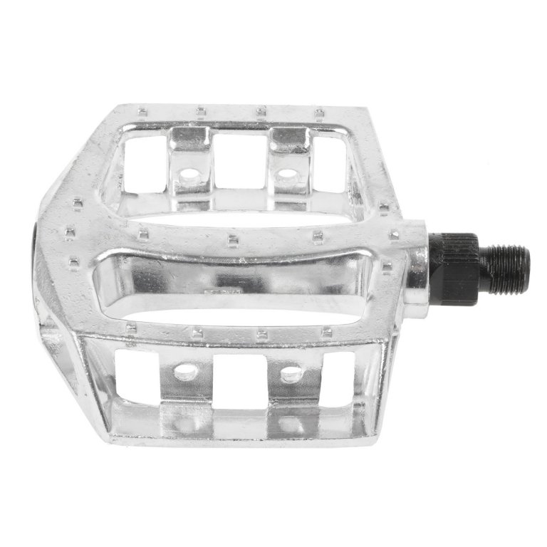 Pedály BMX Materiál: Al Ložiska: kuličková Osa: 9/16" Rozměry: 94 x 87 mm Barva: stříbrná Odrazky: ne Hmotnost: 390 g Balení: servisní v sáčku Určeno pro odborný servis