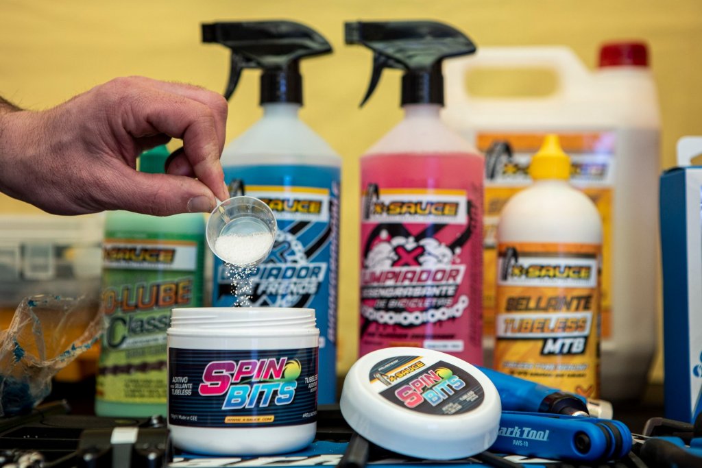Jednoduše nasypte do těsnicí kapaliny prášek v doporučeném množství a promíchejte, příp. po uzavření pláště proklepejte pneu s ráfkem tak, aby došlo k dobrému promísení. O perfektní rozložení se poté postará již otáčení kola při jízdě.
