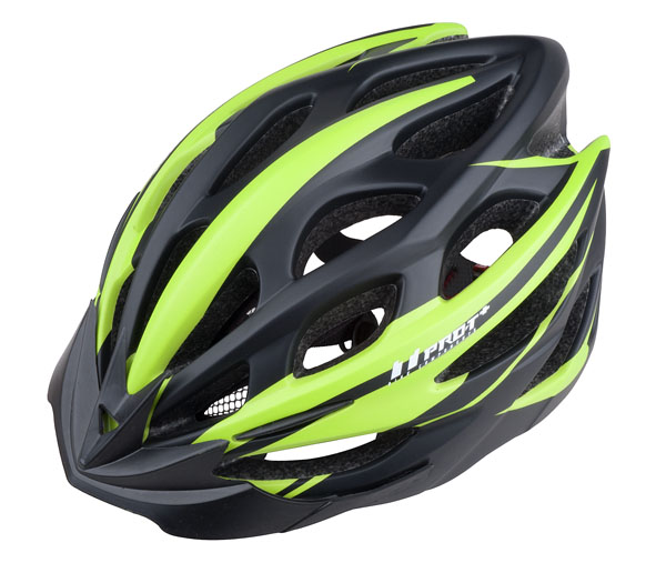 Sportovní přilba s odnímatelným štítkem a síťkou proti hmyzu. Konstrukce In mold, nastavení obvodu pomocí kolečka, hmotnost 230g, 24 větracích otvorů.