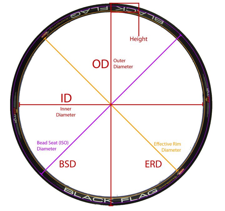 Výpočet pro rozměr 622:(hodnota ETRTO 622,3 mm (viz. na uvedeném obrázku označeno BSD). + 2x výška háku + 2x tloušťka stěny hřbetu – 2x výška ráfku (viz. na uvedeném obrázku označeno HEIGHT).