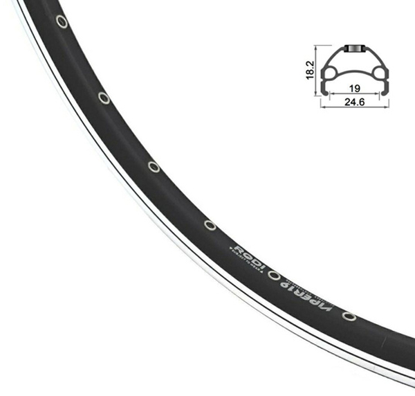 28" (622x19) dvojstěnný tříkomorový plášťový ráfek, 32 děr, pro V- brzdy, broušený bok, jednoduchý nýt otvor pro ventilek: 8,5 mm, výška ráfku: 18 mm, materiál: Al hliník, hmotnost: 525 g