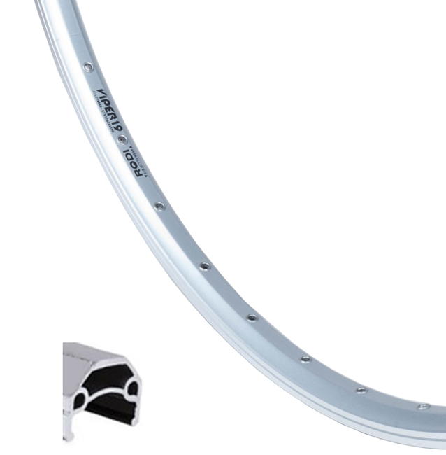 28" (622x19) dvojstěnný tříkomorový plášťový ráfek, 36 děr, pro V- brzdy, broušený bok, jednoduchý nýt otvor pro ventilek: 8,5 mm, výška ráfku: 18 mm, materiál: Al hliník, hmotnost: 525 g