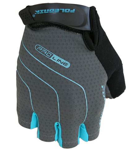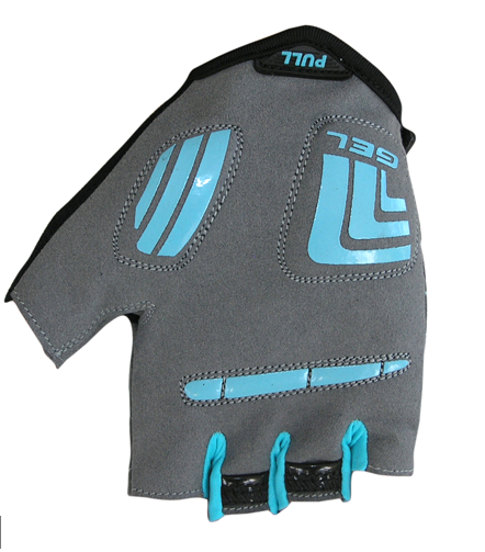 Dlaň: částečně perforovaná syntetická kůže, gelové vycpávky, protiskluzový silikonový potisk, poutka pro snadné stahování