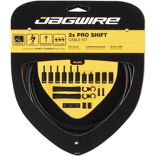 Sady Jagwire 2x Pro Shift poskytují vyšší výkon a styl. Lanka Pro Polished Slick Stainless a vložky pouzdra Slick-Lube poskytují upgrade oproti systémům OEM, zvýšenou přesnost řazení a dlouhotrvající výkon.