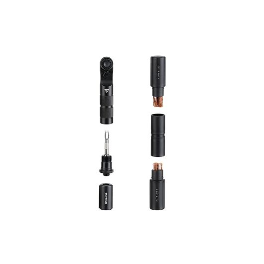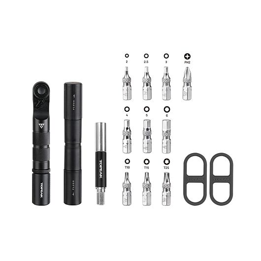 Kompaktní srolovatelná multifunkční sada nářadí s ráčnou, sadou na opravu bezdušových pneumatik / sadou na huštění CO2. Ideální společník na cesty. Ráčnový mechanismus s jemnými zuby, reverzní páčka a kolečko pro rychlé otáčení. Sada obsahuje držák bitů Speed Sleeve, nástroje z tvrzené oceli s imbusem 2, 2,5, 3, 4, 5, 6 mm, bity T10, T15, T25 Torx®, bit křížového šroubováku #2, hliníkovou hustilku CO2, nástroj na vkládání 3,5 mm knotů, knoty na opravu pneumatik. Ultrazvukově svařované rolovací balení udrží věci uspořádané a bezpečně uložené, a dokonce má kapsu na uložení dvou silikonových pásků pro přenášení jedné 16g CO2 kartuše a dvou montpák na pneumatiky.