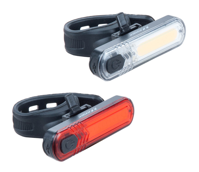 Sada světel - 10 COB LED chips, přední 60 lumenů, zadní 30 lumenů, USB dobíjecí kabel součást balení, 4 režimy svícení (Eco 15%, normal 30%, medium 50%, high 100%), 4 režimy blikání (pomalý záblesk s normálním paprskem, pomalý záblesk se středním paprskem, pomalý záblesk s vysokým paprskem, quick flash se středním paprskem), Li-poly baterie (3,7V/330mAh), indikátor slabé baterie, doba dobíjení cca 3 hodiny, dvojitým stiskem měníte funkce, dlouhým stiskem zapnete světlo, voděodolné: IPX4, hmotnost sady 84g