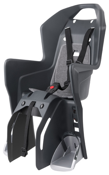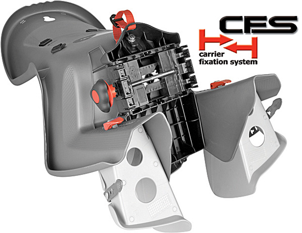 - Upevnění dětské sedačky bez nářadí, spodní část sedačky se pevně připojuje k nosiči pomocí kolečka, sedačka je podélně posuvná