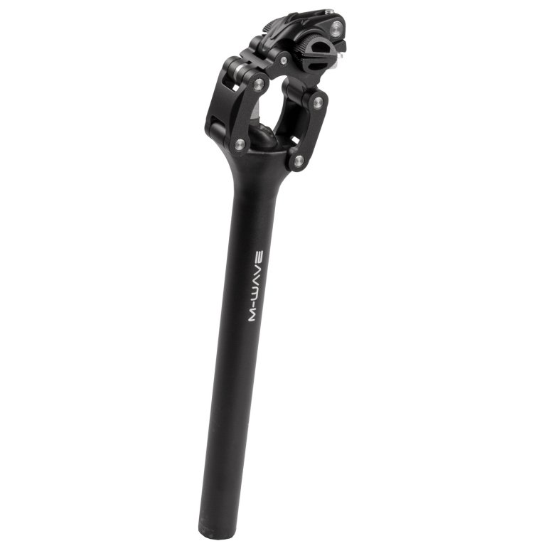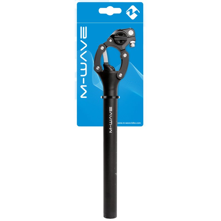 Odpružená sedlovka M-Wave s dvoubodovým uchycením na vzpěrách Průměr: 27,2 mm Délka: 350 mm Materiál: Al Nosnost: 50 - 90 kg Barva: černá Rozsah: 20 mm Vyznačená stupnice na sedlovce Balení: originální karta M-Wave Určeno pro odborný servis