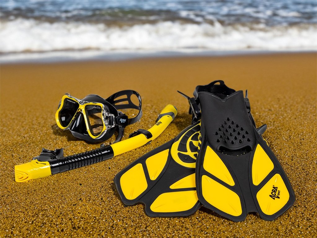 Sada šnorchlu Acra Sport s nastavitelnými ploutvemi, maska z tvrzeného skla se dvěma průhledy, silikonový šnorchl Dry Top a cestovní taška na vybavení. Šnorchlovací set Acra je dokonalý společník na cesty a je vhodný pro šnorchlování, plavání, potápění a mnoho dalšího.