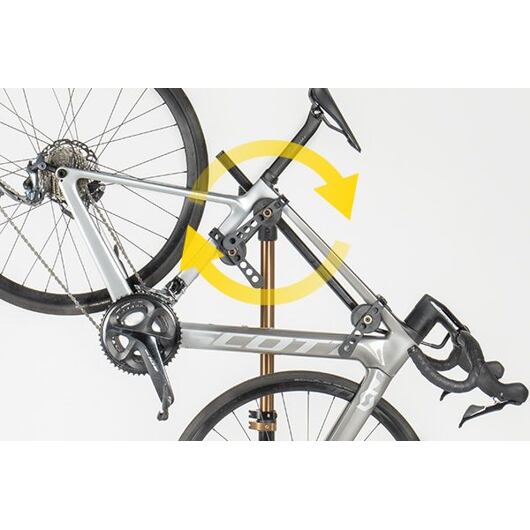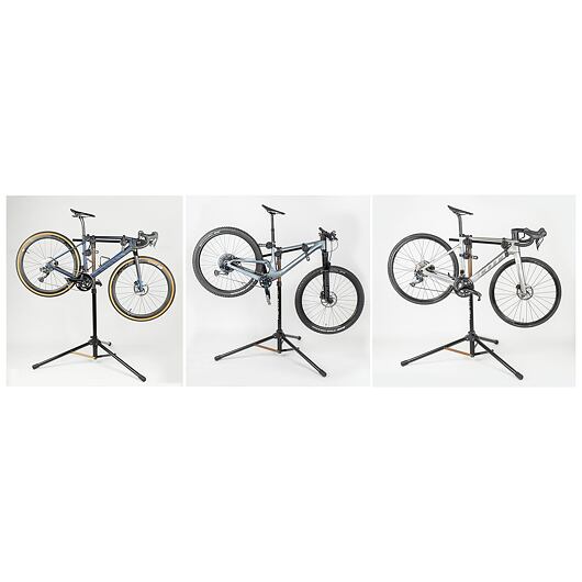 Unikátní nastavitelný tříbodový servisní stojan zajišťuje stabilitu a eliminuje poškození tenkostěnných a aerodynamických trubek. Tři kontaktní svorky s gumovými popruhy se snadno přizpůsobí jakémukoli rámu jízdního kola a upevní se blíže k těžišti kola, čímž se zlepší jeho stabilita. Přiložený stabilizátor řídítek je délkově nastavitelný tak, aby vyhovoval většině jízdních kol a udržoval jejich řídítka a přední kolo v bezpečí. Lze složit do kompaktních rozměrů pro uskladnění.