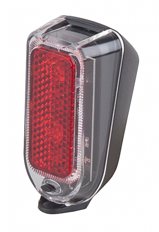 zadní světlo na blatník, 2 červené LED diody, svícení a blikání, se zabudovaným reflektorem, světelný výkon 4Lm, voděodolné provedení IPX3, 2 baterie typu AAA, rozměr 73x36x43mm