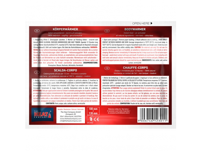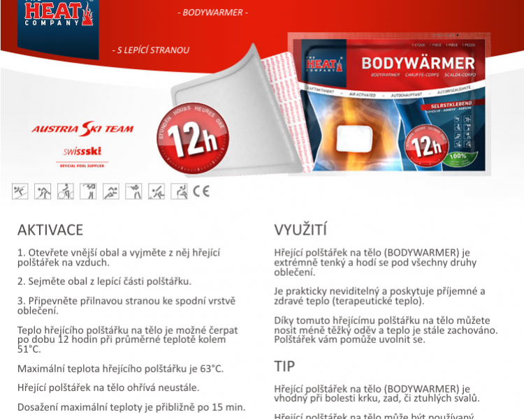 Hřející polštářek na tělo (Bodywarmer) je extrémně tenký a hodí se pod všechny druhy oblečení. Je prakticky neviditelný a poskytuje příjemné a zdravé teplo (terapeutické teplo). Díky tomuto hřejícímu polštářku na tělo můžete nosit méně těžký oděv a teplo je stále zachováno. Hřejívý polštářek na tělo může být umístěn například pod halenkou nebo košilí na místě, kde chcete teplo. Polštářek vám pomůže uvolnit se. Pro zajištění tepla na Vámi určeném místě je na hřejícím polštářku na tělo lepící strana, díky které můžete přilepit hřející sáček na vámi určené místo na spodním prádle. Po té, co přestane hřející polštářek na tělo hřát, jej vyhoďte do běžného domácího odpadu.