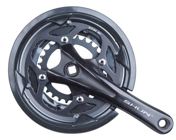 pro 8 kolo, převodníky 48/38/28 s náběhovými segmenty ( AL/Fe/Fe), černý plastový kryt, délka klik 175 mm, doporučená délka osy 113 mm, řetězová linka 48 mm, hmotnost 1060g