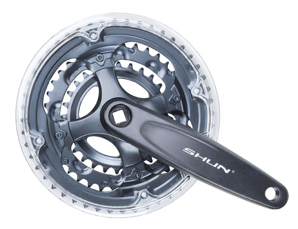 pro 8 kolo, převodníky 48/38/28 s náběhovými segmenty ( Fe/Fe/Fe), čirý plastový kryt, délka klik 170 mm, doporučená délka osy 113 mm, řetězová linka 48 mm,