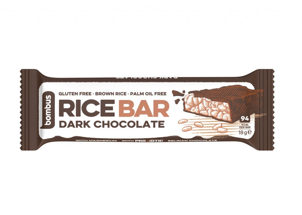 Tyčinka z hnědé rýže s tmavou čokoládou.