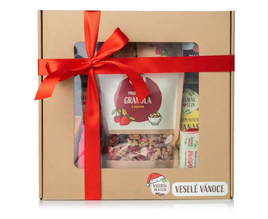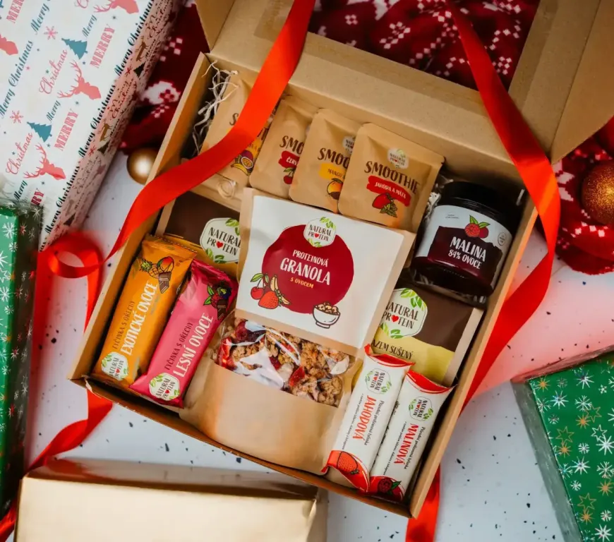 Jídlo je nejlepší dárek. A když je těch dobrot hned 12 najednou, k tomu všemu zabalených ve stylové krabici s mašličkou, zaručeně u obdarovaného sklidíte ovoce. Doslova! V nadupaném balíku totiž najde samé zdravé a božsky dobré ovocné mlsání – naše nejlepší smoothie, proteinové a ořechové tyčinky, granolu, malinový džem nebo mrazem sušené mango a ananas. Tak šťastné a ovocné!