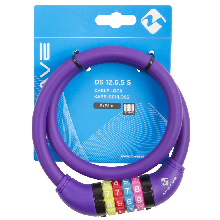 Průměr lanka: 12 mm Délka řetězu: 650 mm Individuální měnitelný čtyřmístný kód Zámek je potažen silikonem Barva: fialový Balení obsahuje 2 klíče Balení: karta M-Wave