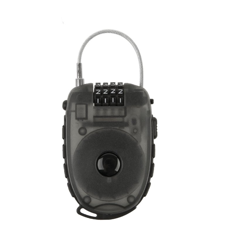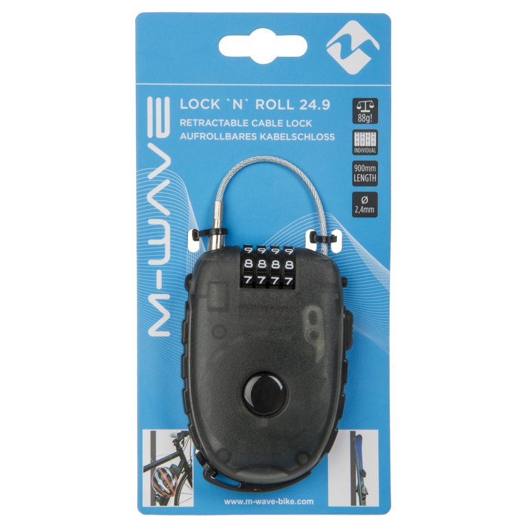 Průměr lanka: 2,4 mm Délka lanka: 900 mm Nastavitelný čtyřmístný bezpečnostní kód Pomocí stisknutí tlačítka se kabel automaticky zaroluje Barva: černá transparentní Balení: karta M-Wave