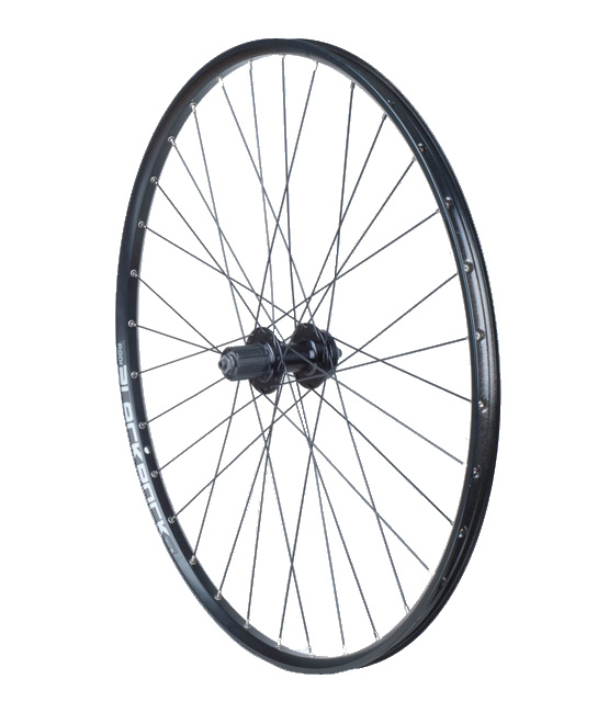 dvojstěnný tříkomorový ráfek ráfek Blackrock 23, výška ráfku 16 mm, náboj zadní 8/11 rychlostí 32 děr DB 600 disc šestiděrový , výplet černý nerez, hmotnost 1316 g