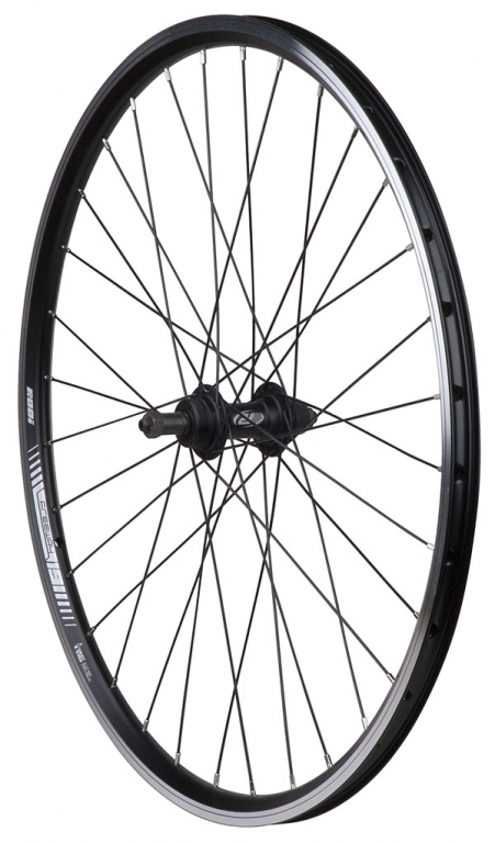 Zadní kolo. Dvoustěnný ráfek RODI Freeway 559x19, černý, 36 děr, broušený bok na V-brzdy s indikací opotřebení. Náboj černý FM 31 na šroubovací 6/7mi kolečko s rychloupínákem.Hmotnost 1055g.