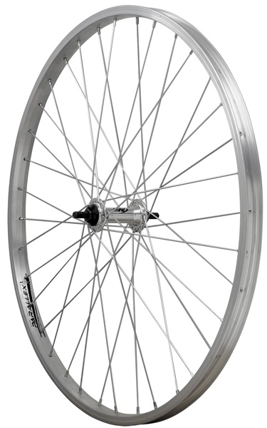 Přední kolo. Jednostěnný ráfek RODI Parallex 622x21s indikaci opotřebení, 36 děr, na V-brzdy, Al náboj Formula FM21 na matice ( součásti balení). Hmotnost 980g
